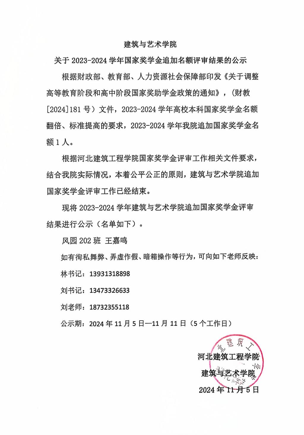 建筑与艺术学院 关于2023-2024学年国家奖学金追加名额评审结果的公示