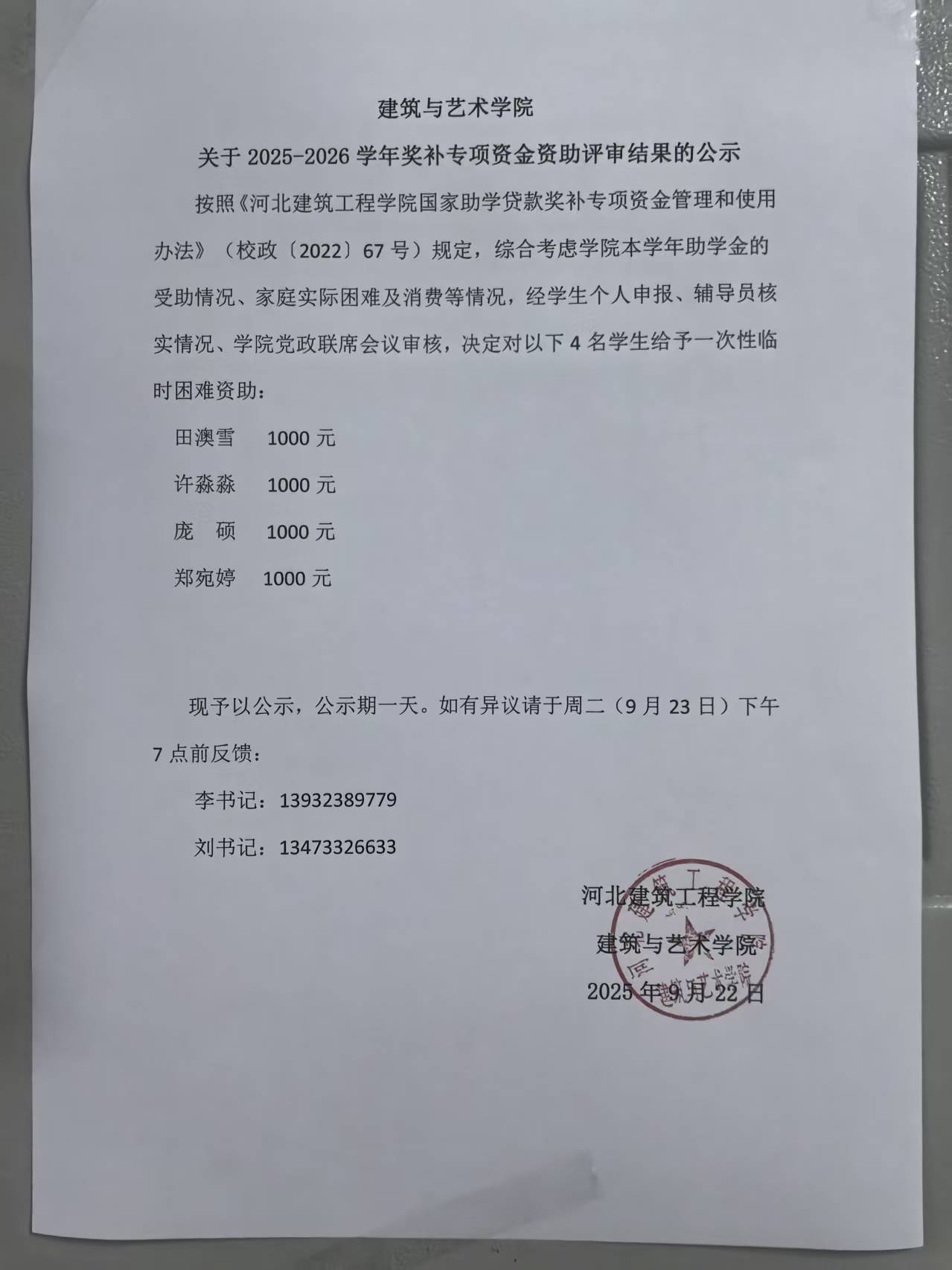 建筑与艺术学院关于2025-2026学年奖补专项资金资助评审结果的公示